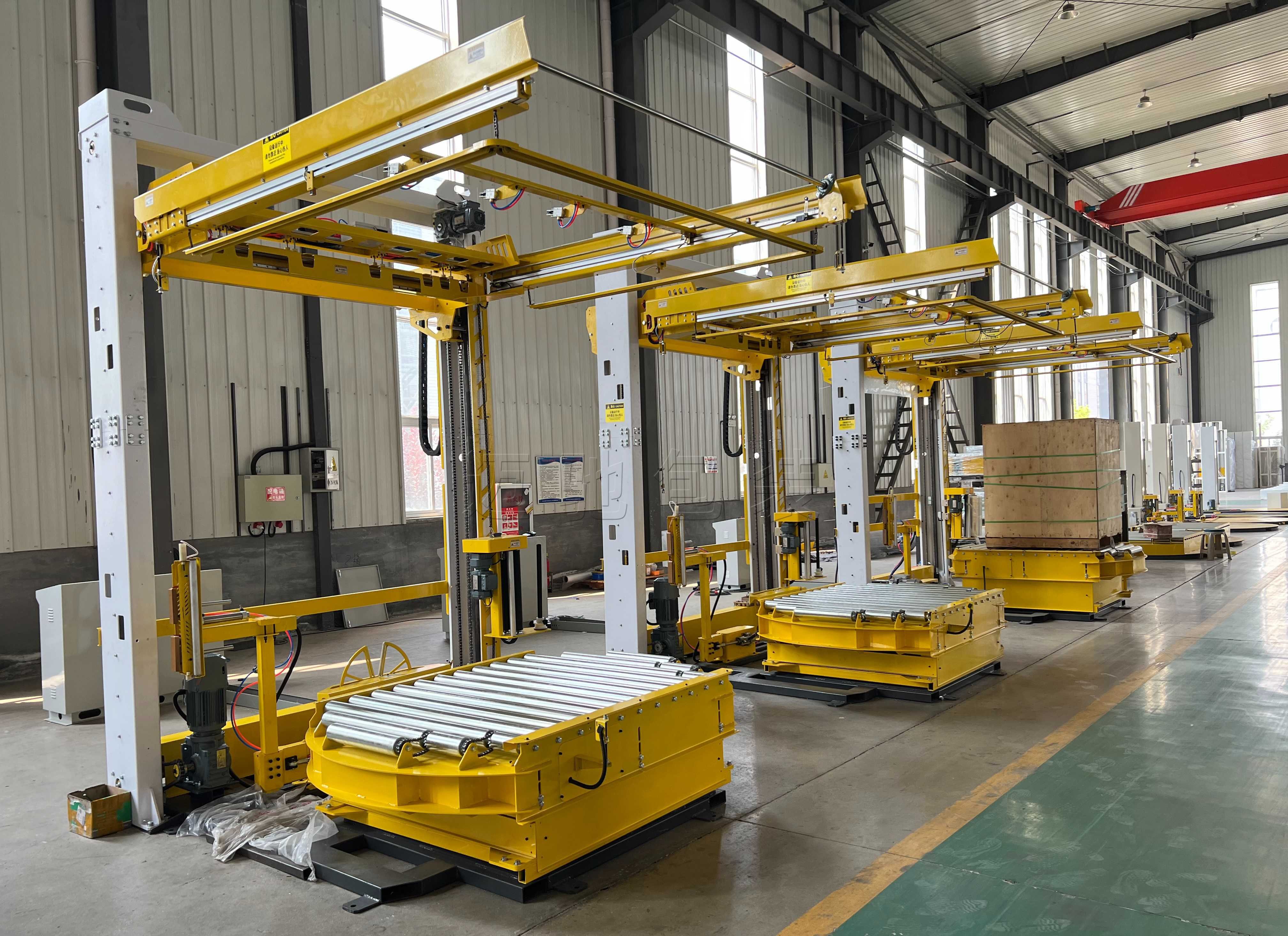 自动穿箭打包机打包,龙门码垛机自动码垛,缠绕膜包装防潮。